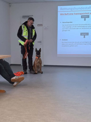 Die sogenannten Mantrailer sind auf die Personensuche an Land spezialisiert. In einer kurzen Theorieeinheit wurde der Verein vorgestellt und erklärt, wie eine Personensuche abläuft und wie die beeindruckende Nase eines Hundes funktioniert.